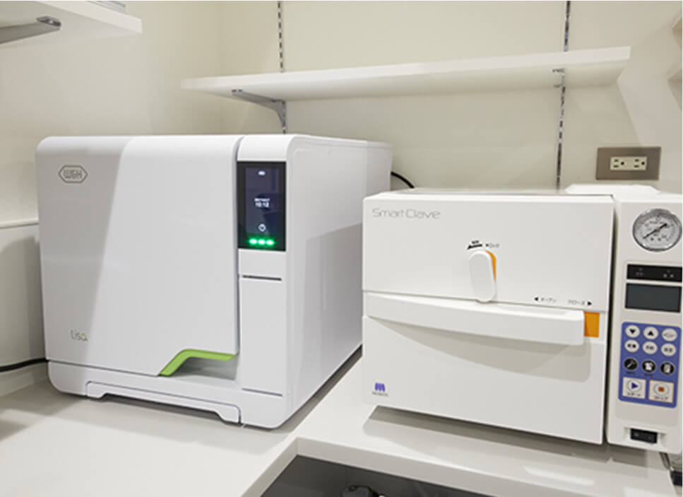 清潔な環境と臨床設備 - ウイルスなどによる二次感染を防ぐために、空気、水、材料、設備、すべてを清潔に院内環境をクリーンに維持します。口腔外バキュームによる空気洗浄、滅菌器による器具の消毒を含め、院内感染防止マニュアルを徹底し、安心して受診できるように取り組んでいます。